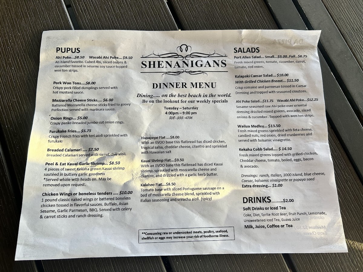 If you're looking for a place where good food and great vibes meet, the Shenanigans Menu is exactly what you need. Nestled in Kekaha, HI, this menu brings together a delicious mix of flavors that will have you coming back for more. From mouthwatering appetizers to satisfying entrees, everything is crafted with care and packed with flavor. Whether you're in the mood for a juicy burger, fresh seafood, or something with a unique twist, there's something for everyone here.